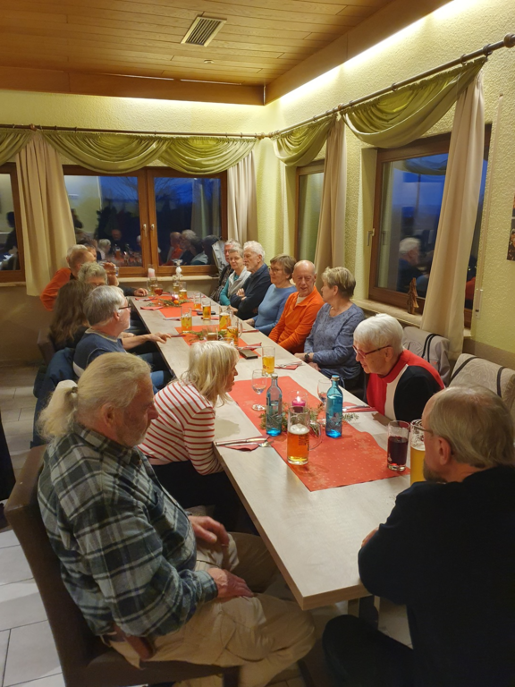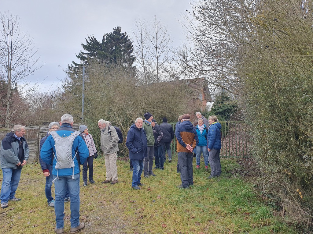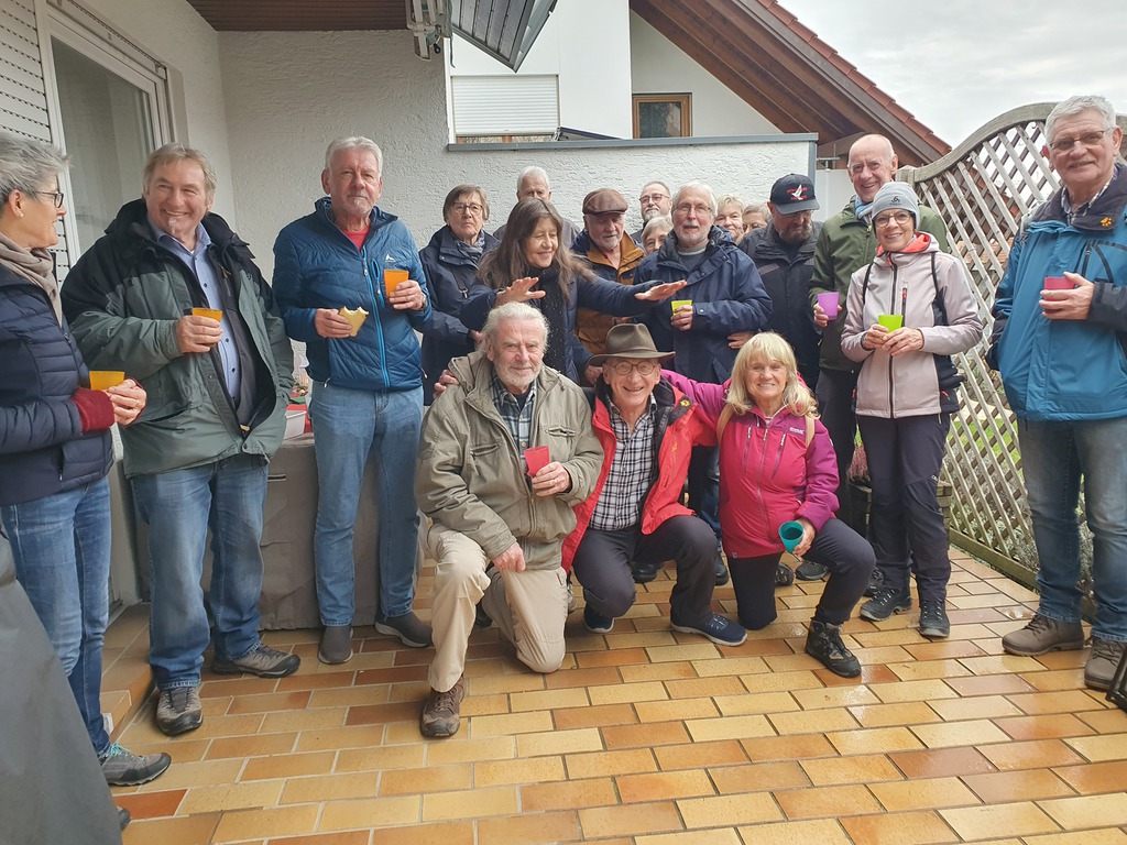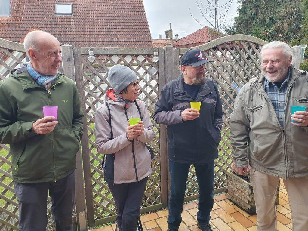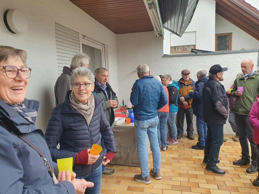 Unsere Wanderung begann bei Doris und Ulrich auf deren Terrasse . Dort genossen wir dampfenden Glühwein und selbstgemachte Backwerke wie Hefezopf, Früchtebrot und Gutsle. Kurz vor 14 Uhr machten wir uns zu achtzehnt dann auf den Weg Richtung Bahnlinie. Dieser folgten wir bis zur Kreuzstraße und darüber hinaus zum Öschelbronner Bahnwarthäusle. Von dort ging es dann bei meist trockenem, aber kalten Wetter weiter zu den Öschelbronner Sportanlagen. Gegen 16.30 Uhr erreichten wir unser Ziel, das Nebringer Sportheim. Dort wurden wir hervorragend bewirtet. Ulrich bedankte sich herzlich für das von Rolf überreichte (Geld-)Briefkuvert und hoffte, dass wir im nächsten Jahr wieder viele solch' schöner Wanderungen bei guter Gesundheit unternehmen können.