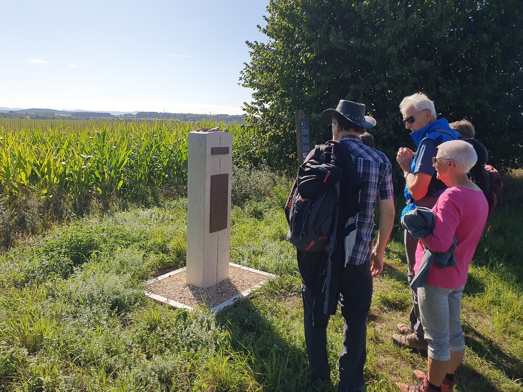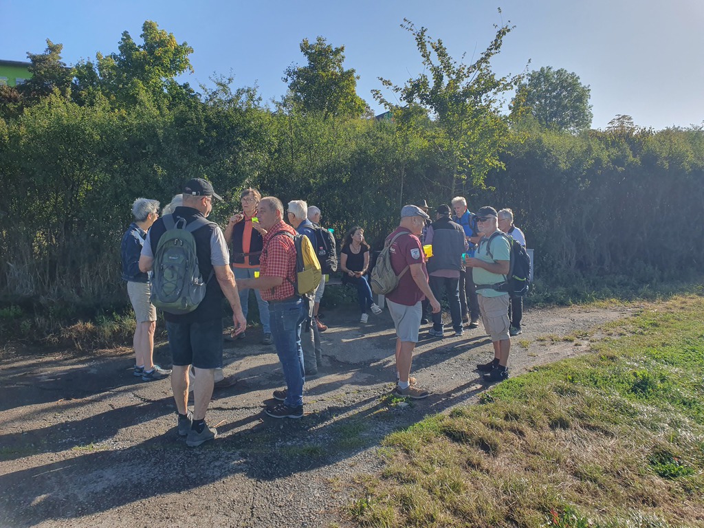 Bei herrlichem Wanderwetter ging's dieses Mal schon um halb neun Uhr am Vereinsdomizil in der Breite Straße los. 17 Wanderer hatten sich eingefunden, um mal wieder die nähere Nachbarschaft zu durchstreifen. Beim Wertstoffhof machten wir die erste Pause für unser zweites Frühstück. Rolf Hähnle brachte den Sekt mit und wir stießen auf sein Wohl im neuen Lebensjahr an. Dann ging's an den Weildorf-Höfen vorbei zur KZ-Gedenkstätte, wo uns die neuen Denkmale (Skulpturen tragen einen Betonpfeiler eines ehemaligen Hangars, Gedenkstein am ehemaligen Massengrab) an das fürchterliche Geschehen vor 80 Jahren aufmerksam machten.