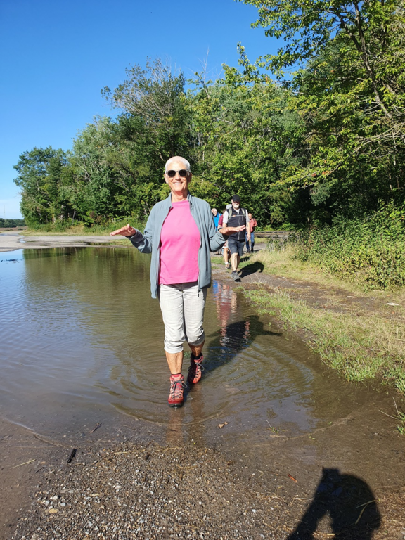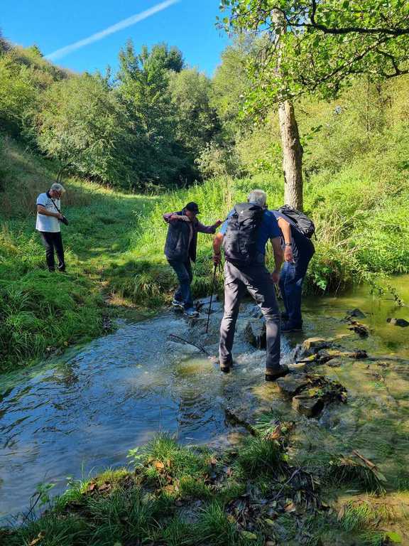 Bald war der Eingang des Naturschutzgebiets Kochhartgraben an der Kläranlage erreicht. Alle waren begeistert von der landschaftlichen Schönheit, die uns hier in diesem tief eingeschnittenen, kilometerlangen Tal erwartete. Der Bach führte aufgrund des starken Regens der Tage zuvor viel Wasser, was bei Manchen zu nassen Füßen beim abenteuerlichen Überqueren führte. Aber das war nicht weiter schlimm, wir zogen in die Höhe und erreichten bald den Reustener Sportplatz. Unten im Ort überquerten wir die Ammer und begleiteten sie bis nach Altingen hinein. Imposant das Werk der Biber, die auch vor größten Bäumen keine Scheu haben, diese umzulegen. Dann war es nicht mehr weit bis zu unserem Ziel, der Gaststätte "S'Bahnhöfle", wo wir um halb eins bereits erwartet wurden. Dort konnten wir im Freien das gute und reichhaltige Essen genießen. Genau gegenüber holte uns kurz vor zwei Uhr der Nagolder Bus ab, der uns wieder nach Nebringen brachte. Eine schöne, erlebnisreiche Wanderung endete damit.